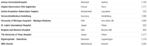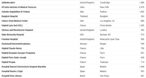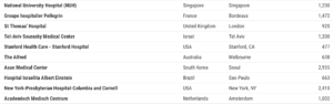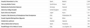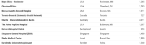 Τα νοσοκομεία 1-50 κατατάσσονται με βάση τις συστάσεις, ενώ τα εκείνα στις θέσεις 51-100 παρατίθενται αλφαβητικά. Στην ακόλουθη κατάταξη φαίνεται η ονομασία του νοσοκομείου, η χώρα, η τοποθεσία και ο αριθμός κλινών.