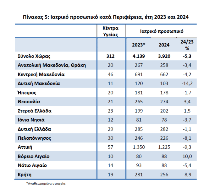 Ο αριθμός του ιατρικού προσωπικού που απασχολείται στα Κέντρα Υγείας παρουσίασε μείωση κατά 5,3% το 2024 σε σχέση με το 2023, στο σύνολο της Χώρας. Αύξηση παρατηρείται το 2024 σε σχέση με το 2023 στις Περιφέρειες Βόρειου Αιγαίου και Θεσσαλίας κατά 10,0% και 3,4%, αντίστοιχα. Μείωση παρατηρήθηκε στις περισσότερες Περιφέρειες το 2024 σε σχέση με το 2023, με μεγαλύτερη στις Περιφέρειες Δυτικής Μακεδονίας και Αττικής κατά 14,2% και 9,3%, αντίστοιχα.