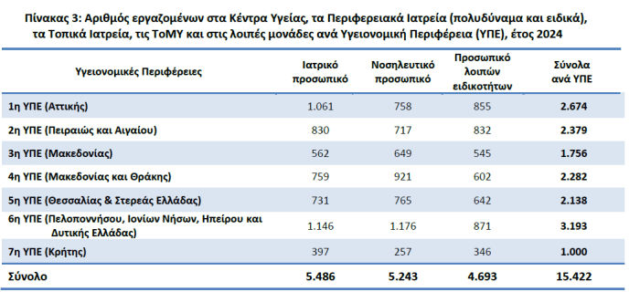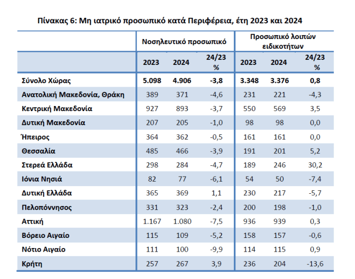 Το νοσηλευτικό προσωπικό μειώθηκε το 2024 σε σχέση με το 2023 κατά 3,8% στο σύνολο της Χώρας. Αύξηση παρατηρείται κατά το 2024 σε σχέση με το 2023 στις Περιφέρειες Κρήτης και Δυτικής Ελλάδας με 3,9% και 1,1%, αντίστοιχα.