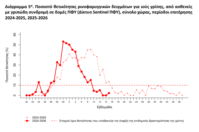 Η θετικότητα για γρίπη στην κοινότητα παραμένει κάτω από το επιδημικό όριο του 10%, επιβεβαιώνοντας την πτωτική πορεία από τις αρχές του έτους. Την εβδομάδα 15/2026 δεν εντοπίστηκαν θετικά δείγματα στα δίκτυα επιτήρησης.