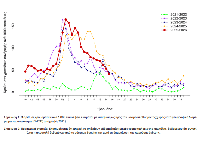 Συνολικά, από την εβδομάδα 40/2025 έως την 15/2026 έχουν καταγραφεί 162 σοβαρά περιστατικά με νοσηλεία σε ΜΕΘ και 82 θάνατοι, ενώ από την αρχή του 2025 οι θάνατοι σε σοβαρά περιστατικά ανέρχονται σε 166.