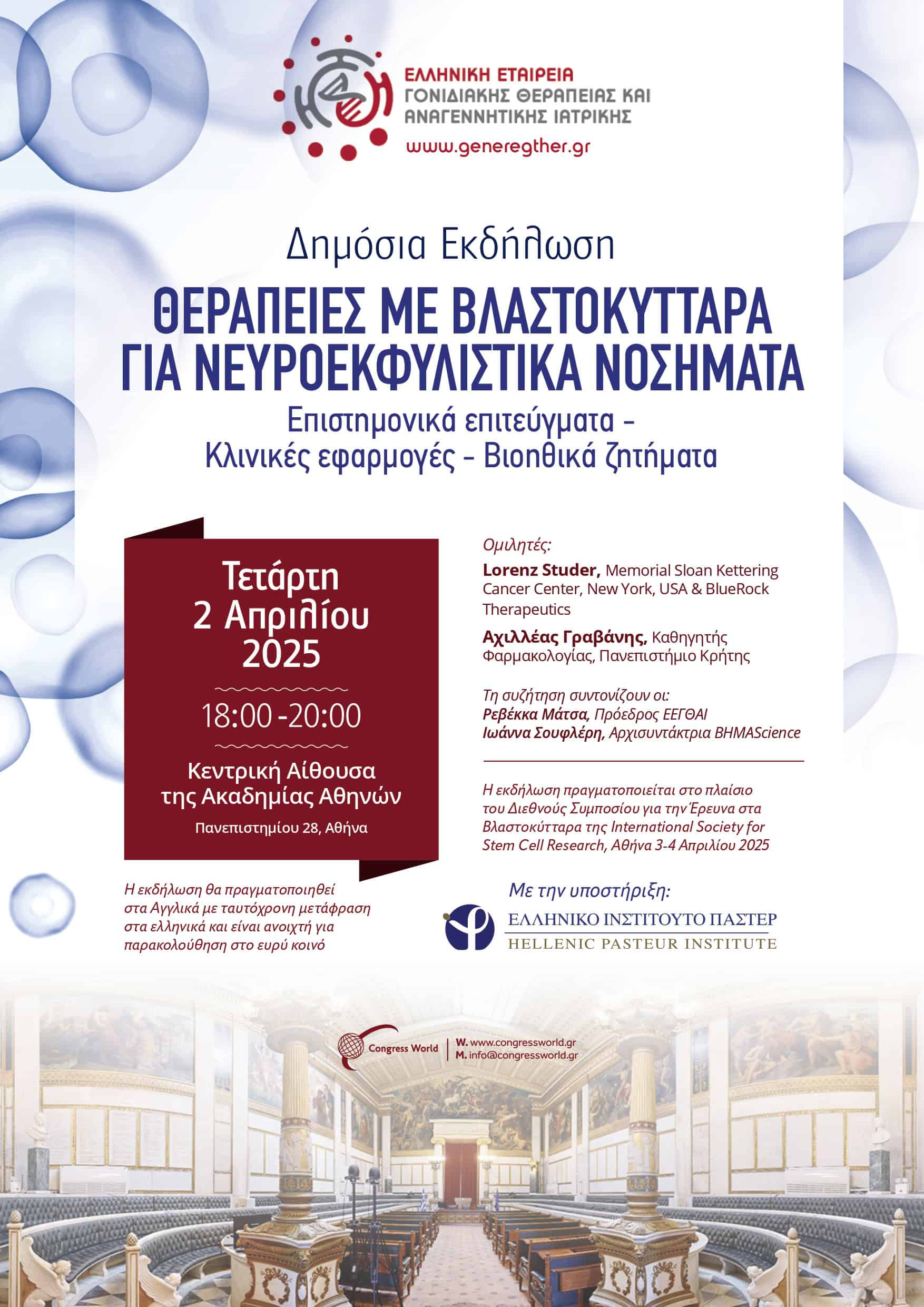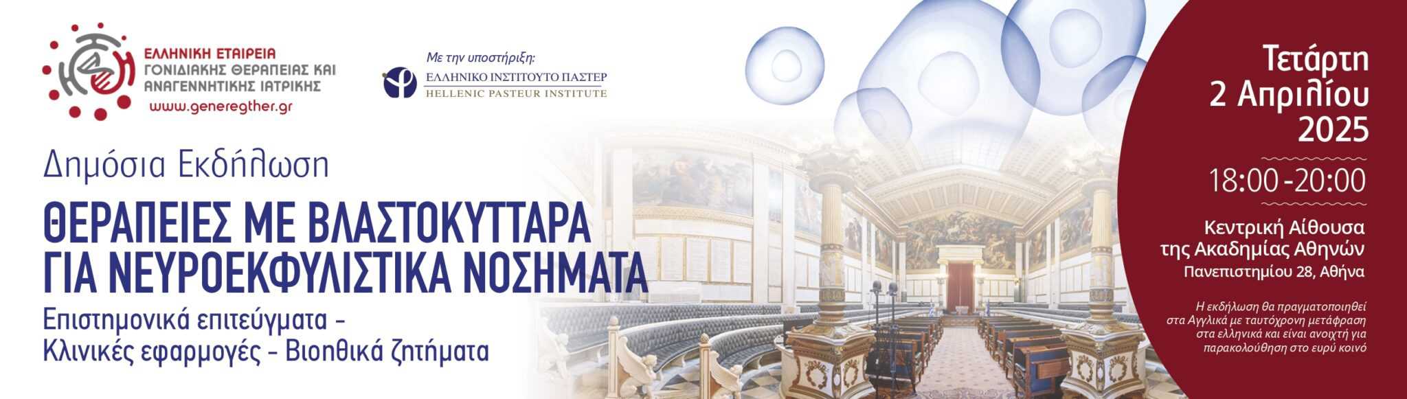 Η Ελληνική Εταιρεία Γονιδιακής Θεραπείας και Αναγεννητικής Ιατρικής – ΕΕΓΘΑΙ διοργανώνει Δημόσια Εκδήλωση με τίτλο: «Θεραπείες με Βλαστοκύτταρα για Νευροεκφυλιστικά Νοσήματα». Στόχος είναι η ενημέρωση του κοινού σχετικά με τις νευροεκφυλιστικές παθήσεις και τις σύγχρονες μεθόδους θεραπευτικής προσέγγισης.