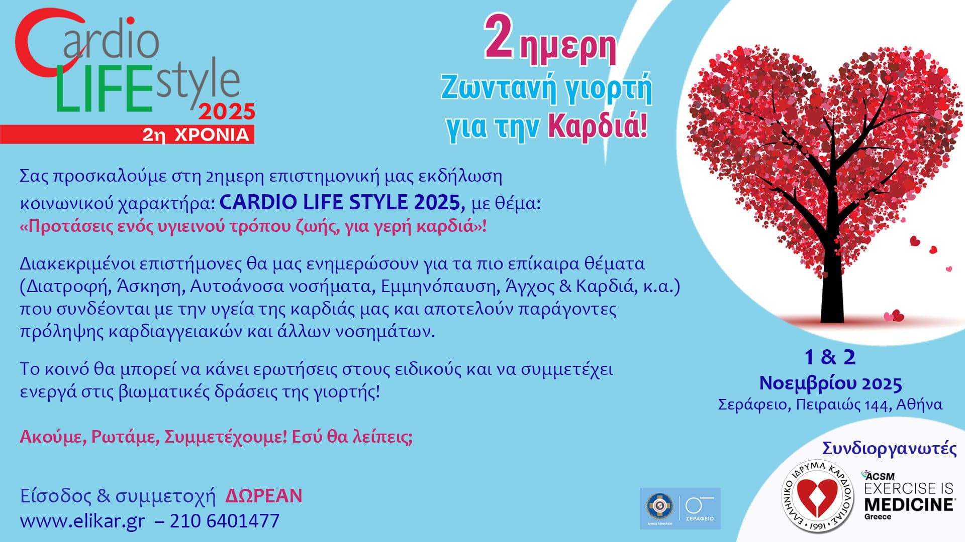 Ανοιχτή πρόσκληση στη 2ήμερη γιορτή καρδιάς: Cardio Life Style 2025 13:00 2025-09-11 - grammateia ΑΝΟΙΧΤΗ ΠΡΟΣΚΛΗΣΗ Στη 2ήμερη ΓΙΟΡΤΗ ΚΑΡΔΙΑΣ: CARDIO LIFE STYLE, για 2η συνεχή Χρονιά! «Υγιεινός Τρόπος Ζωής, γερή καρδιά»! 1 & 2 Νοεμβρίου 2025, στο ΣΕΡΑΦΕΙΟ του Δήμου Αθηναίων Στην Πειραιώς 144, Αθήνα. ΔΩΡΕΑΝ για μεγάλους & μικρούς, για όλους μας! Εσύ θα λείπεις; Ελληνικό Ίδρυμα Καρδιολογίας Βασ. Σοφίας 133, 11521 Αθήνα (210) 6401477 [email protected]