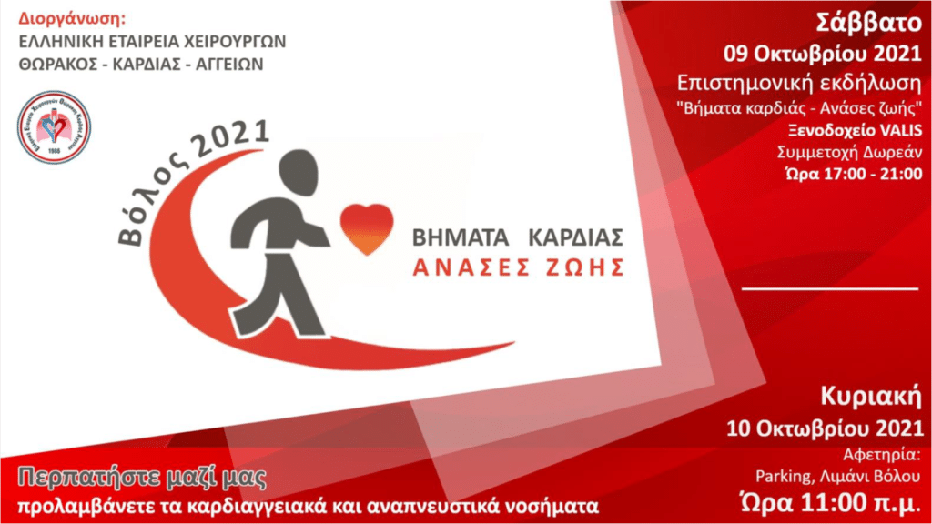 Η Ελληνική Εταιρεία Χειρουργών Θώρακος-Καρδιάς-Αγγείων (Ε.Ε.Χ.Θ.Κ.Α), σε συνεργασία με την Πνευμονολογική Κλινική του Πανεπιστημίου Θεσσαλίας και με την υποστήριξη του Ιατρικού Συλλόγου Μαγνησίας και της αστικής μη κερδοσκοπικής εταιρείας FairLife Lung Cancer Care, διοργανώνει στην όμορφη πόλη του Βόλου την ετήσια φθινοπωρινή της εκδήλωση με τίτλο «Βήματα καρδιάς, ανάσες ζωής».