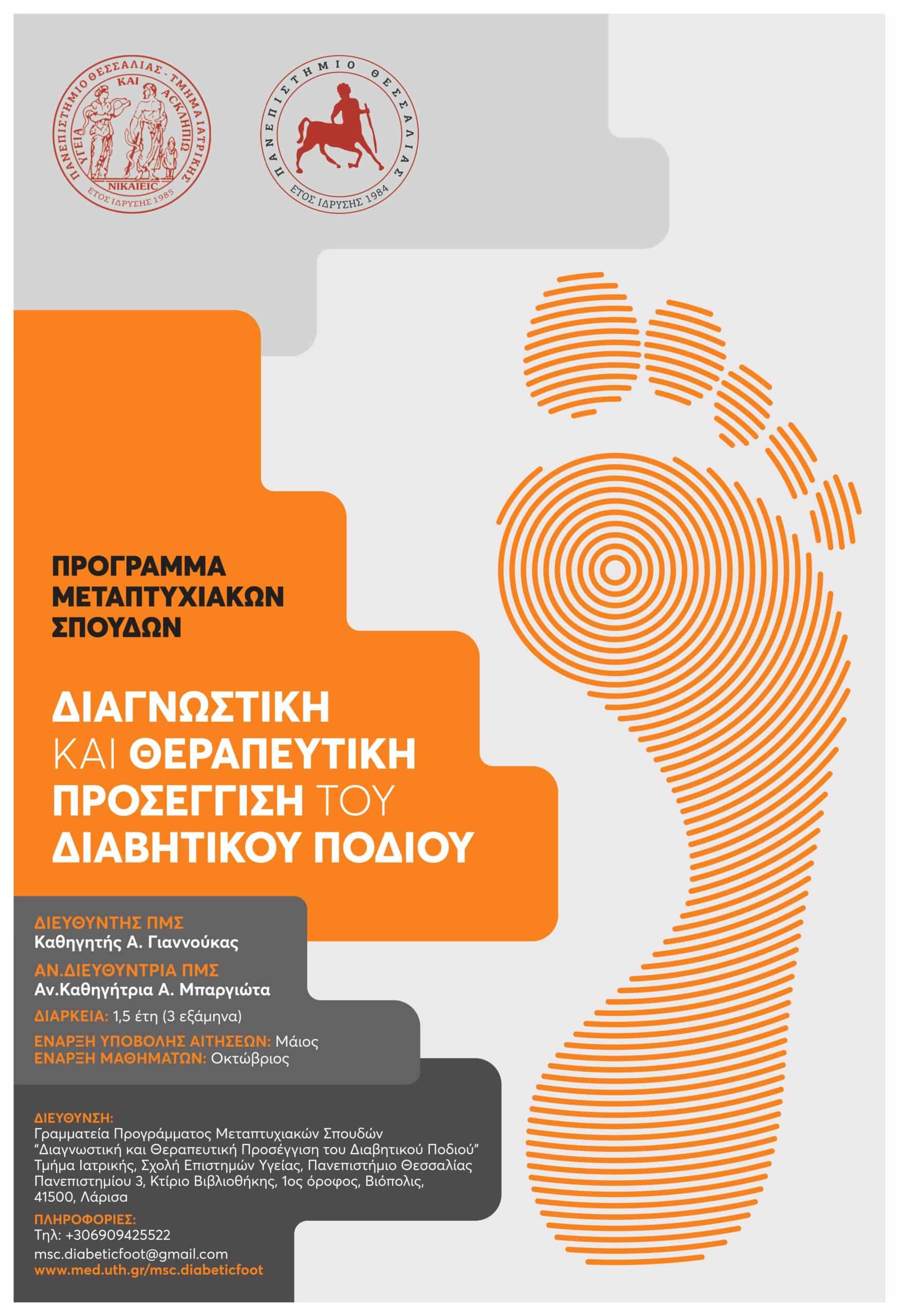 Το Τμήμα Ιατρικής της Σχολής Επιστημών Υγείας του Πανεπιστημίου Θεσσαλίας, ανακοινώνει τη Β’ φάση υποβολής δικαιολογητικών για το ακαδημαϊκό έτος 2022-2023 του Προγράμματος Μεταπτυχιακών Σπουδών (ΠΜΣ) με τίτλο: «Διαγνωστική και Θεραπευτική Προσέγγιση του Διαβητικού Ποδιού».