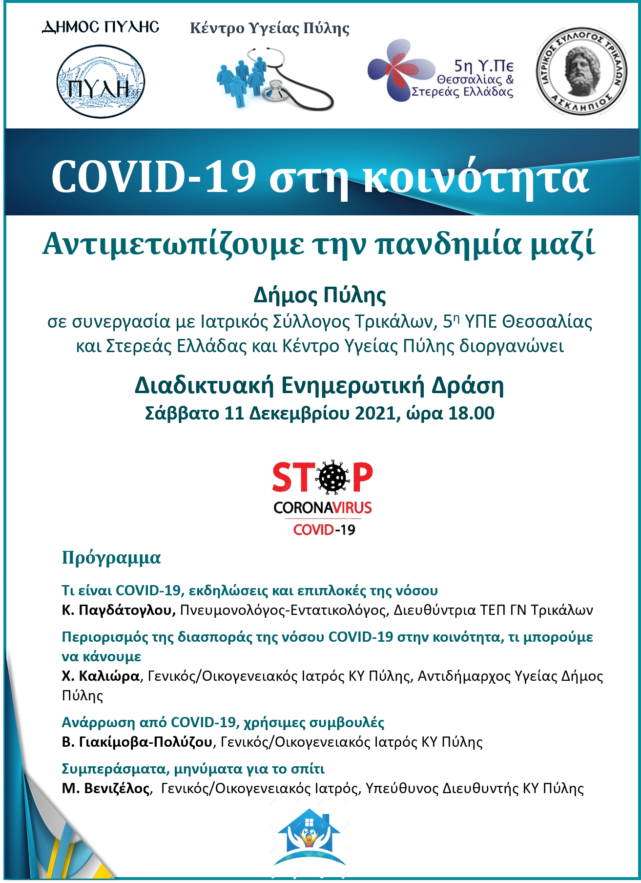 το Σάββατο 11 Δεκεμβρίου 2021, ώρα 18.00μμ, θα διεξαχθεί Διαδικτυακή ΕνημερωτικήΔράση, με θέμα «COVID-19 στην κοινότητα – Αντιμετωπίζουμε την πανδημία μαζί».