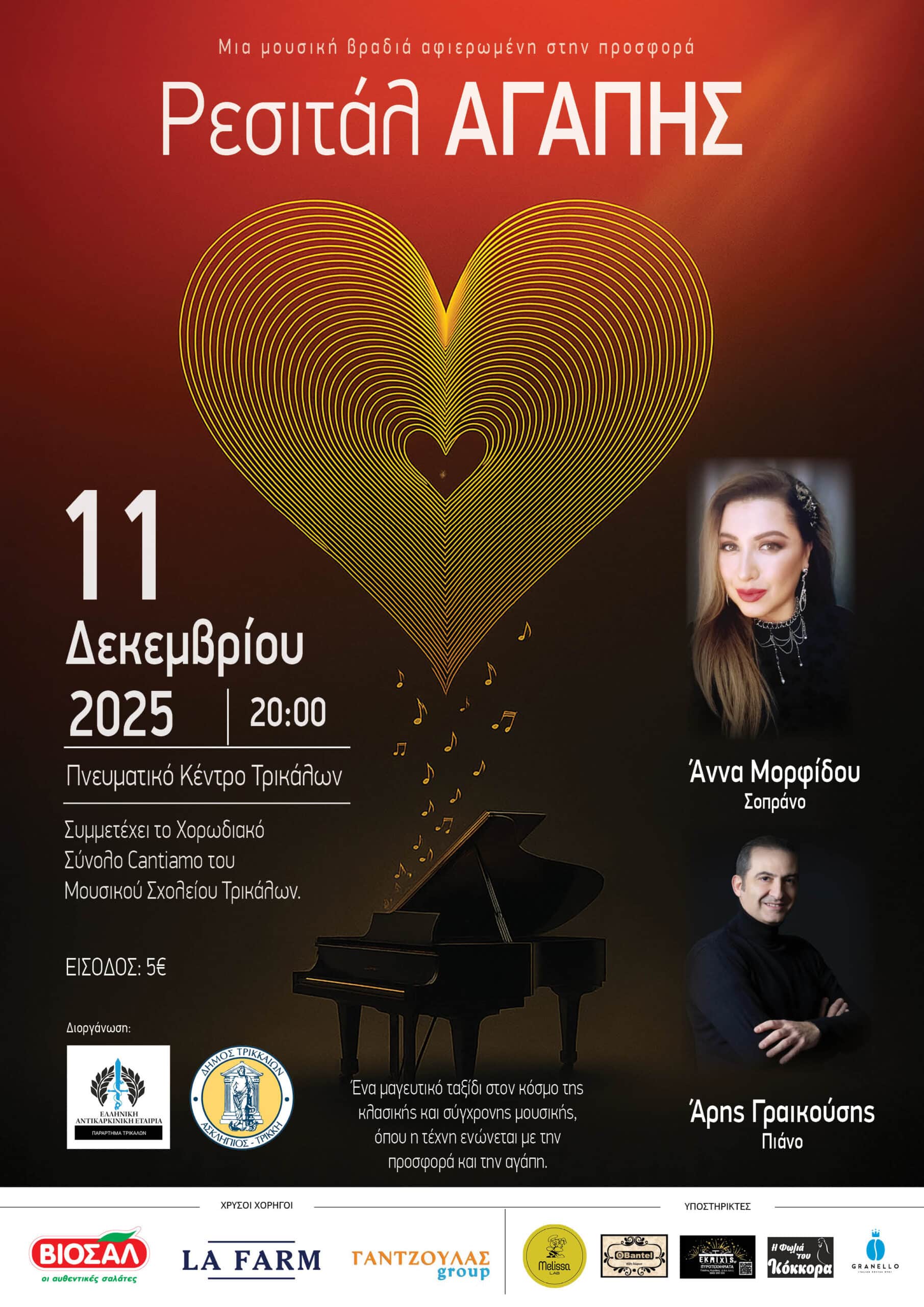 Η Αντικαρκινική Εταιρεία  Παράρτημα Τρικάλων, σε συνεργασία με τον Δήμο Τρικκαίων, διοργανώνει μια ξεχωριστή φιλανθρωπική βραδιά με τίτλο «Ρεσιτάλ Αγάπης», όπου η μουσική συναντά την ανθρωπιά και η τέχνη ενώνει τις ψυχές.