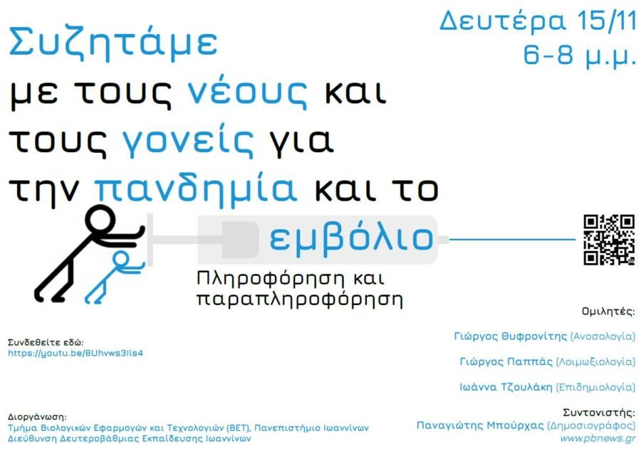 Το Τμήμα Βιολογικών Εφαρμογών και Τεχνολογιών του Πανεπιστημίου Ιωαννίνων και η Διεύθυνση δευτεροβάθμιας εκπαίδευσης Ιωαννίνων διοργανώνουν την διαδικτυακή εκδήλωση «Συζητάμε με τους νέους και τους γονείς για την πανδημία και το εμβόλιο. Πληροφόρηση και παραπληροφόρηση». Η εκδήλωση θα πραγματοποιηθεί τη Δευτέρα 15 Νοεμβρίου, στις 6 με 8 μ.μ..