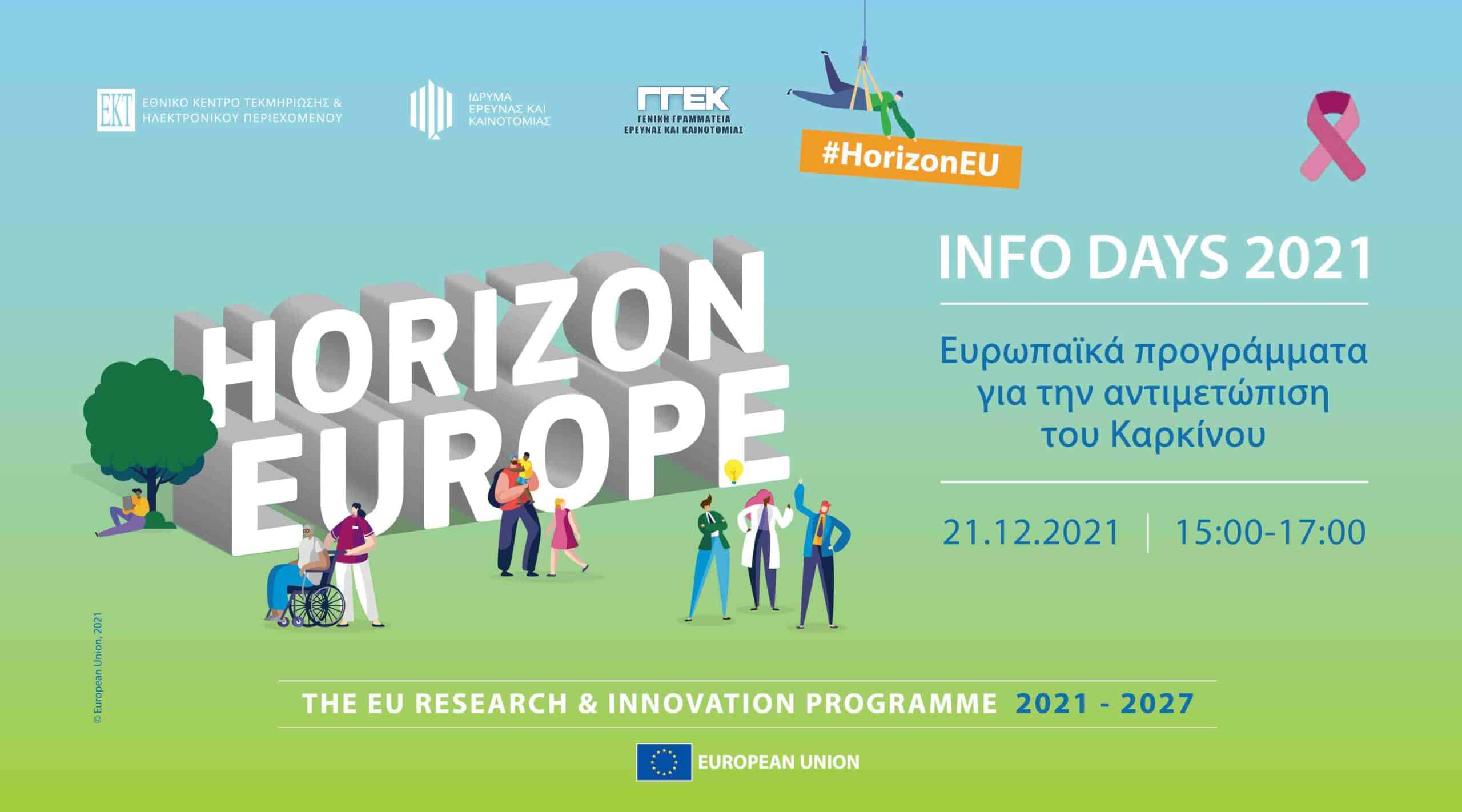 Το Εθνικό Κέντρο Τεκμηρίωσης και Ηλεκτρονικού Περιεχομένου (ΕΚΤ) και το Ίδρυμα Έρευνας και Καινοτομίας (ΙδΕΚ) της Κύπρου, Εθνικά Σημεία Επαφής για τον Ορίζοντα Ευρώπη, σας προσκαλούν στη διαδικτυακή εκδήλωση που διοργανώνουν με θέμα «Ευρωπαϊκά Προγράμματα για την αντιμετώπιση του Καρκίνου», την Τρίτη 21 Δεκεμβρίου 2021 (15:00-17:00). Η εκδήλωση διοργανώνεται σε συνεργασία με τη Γενική Γραμματεία Έρευνας και Καινοτομίας και την Ευρωπαϊκή Επιτροπή (Γενική Διεύθυνση Έρευνας και Καινοτομίας).