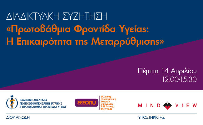 Η Ελληνική Ακαδημία Γενικής/Οικογενειακής Ιατρικής & Πρωτοβάθμιας Φροντίδας Υγείας και η Ελληνική Επιστημονική Εταιρεία Οικονομίας και Πολιτικής της Υγείας διοργανώνουν την Πέμπτη 14 Απριλίου 2022 και ώρα 12:00-15:30, διαδικτυακή συζήτηση με θέμα: «Πρωτοβάθμια Φροντίδα Υγείας: Η Επικαιρότητα της Μεταρρύθμισης», με αφορμή την ανάρτηση για διαβούλευση του νομοσχεδίου του Υπουργείου Υγείας «Γιατρός για όλους, ισότιμη και ποιοτική πρόσβαση στις υπηρεσίες του Εθνικού Οργανισμού Παροχής Υπηρεσιών Υγείας και στην Πρωτοβάθμια Φροντίδα Υγείας και άλλες διατάξεις».