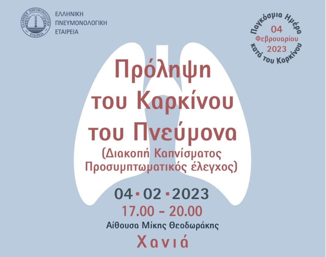 Ειδική ημερίδα με τίτλο «Πρόληψη του Καρκίνου του Πνεύμονα, Διακοπή καπνίσματος – Προσυμπτωματικός έλεγχος» διοργανώνει στα Χανιά στο πλαίσιο της Παγκόσμιας Ημέρας κατά του Καρκίνου (4 Φεβρουαρίου), η Ελληνική Πνευμονολογική Εταιρεία (ΕΠΕ), σε συνεργασία με τον Δήμο Χανίων, την Πνευμονολογική Κλινική του Πανεπιστημίου Κρήτης και τον Σύλλογο Πνευμονολόγων Περιφερειακής Ενότητας Χανίων.