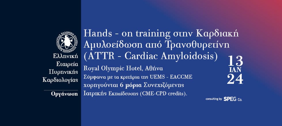 H Ελληνική Εταιρεία Πυρηνικής Καρδιολογίας (Ε.Ε.Π.Κ.) πραγματοποιεί εκπαιδευτική επιστημονική εκδήλωση για την Καρδιακή Αμυλοείδωση από Τρανσθυρετίνη (ATTR-Cardiac Amyloidosis). Η εκδήλωση θα διεξαχθεί στις 13 Ιανουαρίου στο Royal Olympic Hotel (Αθήνα).