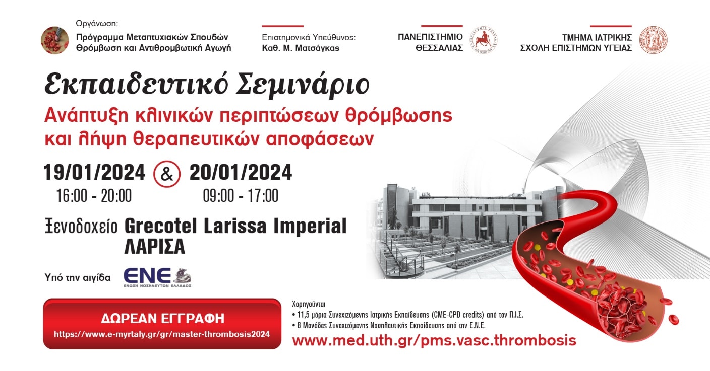 To Εκπαιδευτικό Σεμινάριο που θα πραγματοποιηθεί την Παρασκευή 19 (16:00 – 20:00) και το Σάββατο 20 Ιανουαρίου (09:00 – 17:00) 2024, στο ξενοδοχείο Grecotel Larissa Imperial στη Λάρισα, διοργανώνεται από το Πρόγραμμα Μεταπτυχιακών Σπουδών «Θρόμβωση και Αντιθρομβωτική Αγωγή» του Τμήματος Ιατρικής της Σχολής Επιστημών Υγείας του Πανεπιστημίου Θεσσαλίας, με Επιστημονικά Υπεύθυνο τον Καθηγητή κ. Μ. Ματσάγκα.