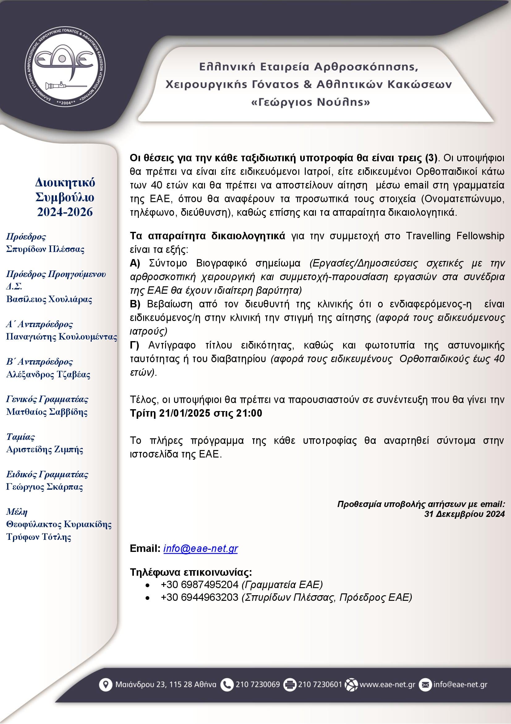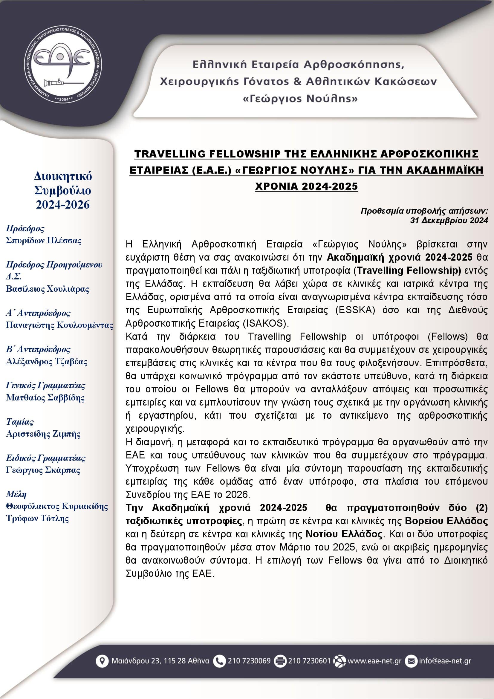 Ελληνική Εταιρεία Αρθροσκόπησης, Χειρουργικής Γόνατος & Αθλητικών Κακώσεων : Travelling Fellowship 2024-2025 8:41 2024-12-09 - grammateia Εκ της γραμματείας Ελληνική Αρθροσκοπική Εταιρεία www.eae-net.gr