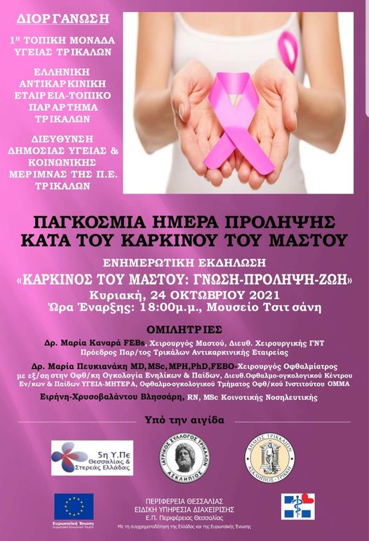 Με αφορμή λοιπόν, την Παγκόσμια Ημέρα Πρόληψης κατά του Καρκίνου του Μαστού η 1η ΤΟΠΙΚΗ ΜΟΝΑΔΑ ΥΓΕΙΑΣ (ΤΟΜΥ) ΤΡΙΚΑΛΩΝ θα πραγματοποιήσει την Κυριακή 24 Οκτωβρίου 2021 στις 18:00 μ.μ. στο Μουσείο Τσιτσάνη, Ενημερωτική Εκδήλωση με θέμα «Καρκίνος του Μαστού, Γνώση-Πρόληψη-Ζωή», σε συνεργασία με την Ελληνική Αντικαρκινική Εταιρεία Παράρτημα Τρικάλων, τη Διεύθυνση Δημόσιας Υγείας και Κοινωνικής Μέριμνας της Π.Ε. Τρικάλων.