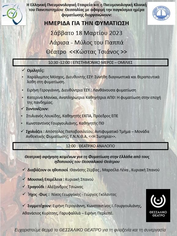 Η ιστορία της Φυματίωσης μέχρι και σήμερα θα αναδειχθεί το προσεχές Σάββατο 18 Μαρτίου 2023 στη Λάρισα (Μύλος του Παππά)- Θέατρο Κώστας Τσιάνος.