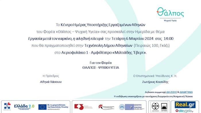 Ο φορέας “Θάλπος – Ψυχική Υγεία ”, παρέχοντας επί 19 χρόνια υψηλής ποιότητας δωρεάν υπηρεσίες ψυχικής υγείας προς όλους τους πολίτες, υπό την εποπτεία του Υπουργείου Υγείας, διοργανώνει επιστημονική ημερίδα με θέμα: “Εργασία μετά τον καρκίνο. Η αληθινή πλευρά”, την Τετάρτη 6 Μαρτίου 2024 και ώρα 14:00 έως 19:00 στο Αμφιθέατρο “ Μιλτιάδης Έβερτ” της Τεχνόπολης του Δήμου Αθηναίων.