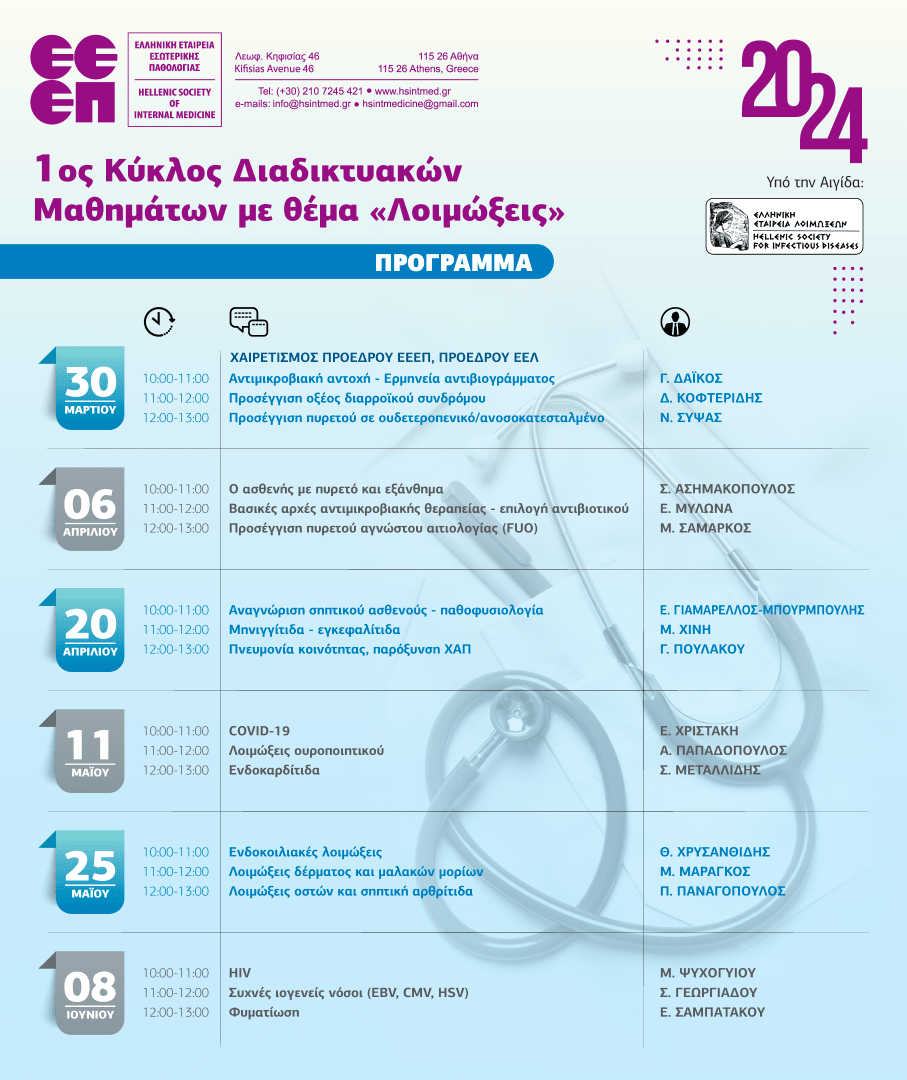 | Η Ελληνική Εταιρεία Εσωτερικής Παθολογίας (Ε.Ε.Ε.Π.), στο πλαίσιο των εκπαιδευτικών της δραστηριοτήτων, αρχίζει κύκλους μαθημάτων για τους ειδικευόμενους (και όχι μόνον) Ιατρούς στην Εσωτερική Παθολογία, με στόχο να καλυφθούν τα κύρια γνωστικά αντικείμενα που περιλαμβάνονται στο Curriculum της ειδικότητας της Εσωτερικής Παθολογίας, όπως καθορίζεται στο ΦΕΚ 2856-Β (05-07-2019).