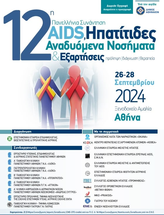 Η 12η Πανελλήνια Συνάντηση «AIDS, Ηπατίτιδες, Αναδυόμενα Νοσήματα & Εξαρτήσεις» θα πραγματοποιηθεί από τις 26 έως τις 28 Σεπτεμβρίου στην Αθήνα. Σκοπός είναι η σφαιρική προσέγγιση του HIV/AIDS, των ιογενών ηπατιτίδων, των εξαρτήσεων, της πανδημίας COVID-19 και άλλων αναδυόμενων παραγόντων, αφιερώνοντας χρόνο για τα πραγματικά προβλήματα τα οποία απασχολούν επιστήμονες υγείας, ασθενείς, ευάλωτους πληθυσμούς, αρχές δημόσιας υγείας και κοινό.