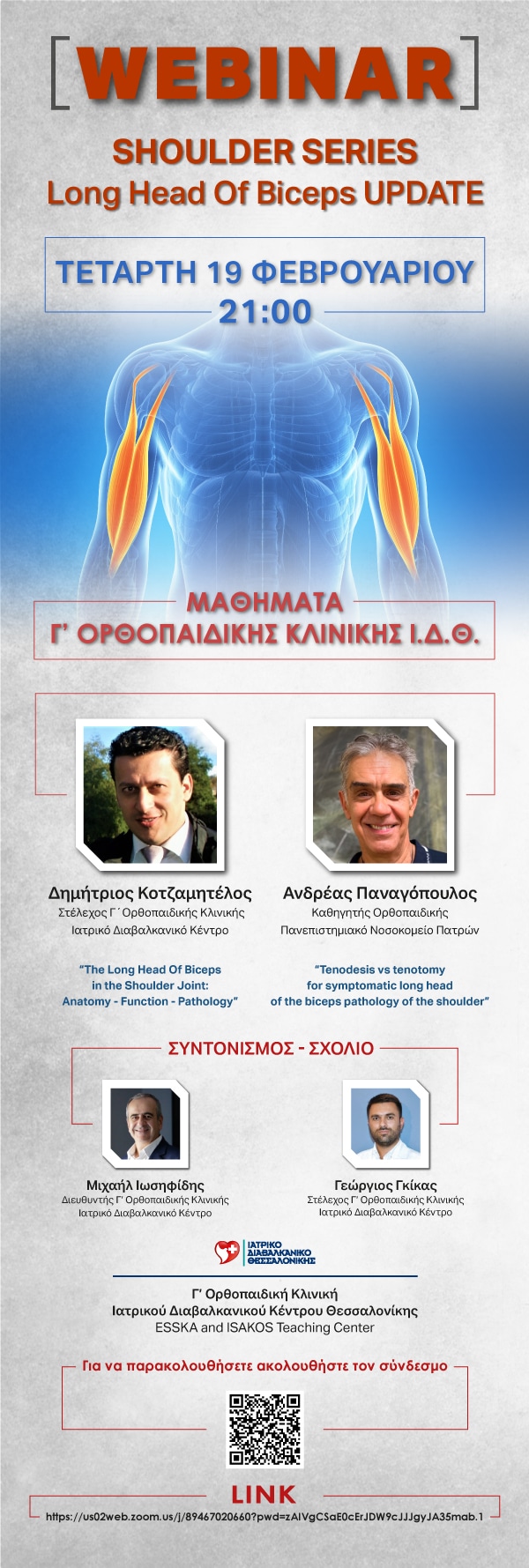 Μετεκπαιδευτικά Μαθήματα Γ’ Ορθοπαιδικής Κλινικής ΙΔΘ–webinar -SHOULDER SERIES Long Head of Biceps Update 8:47 2025-02-17 - grammateia ⏰Τετάρτη 19 Φεβρουαρίου 2025, 21:00 | WEBINAR -SHOULDER SERIES Long Head of Biceps Update ..