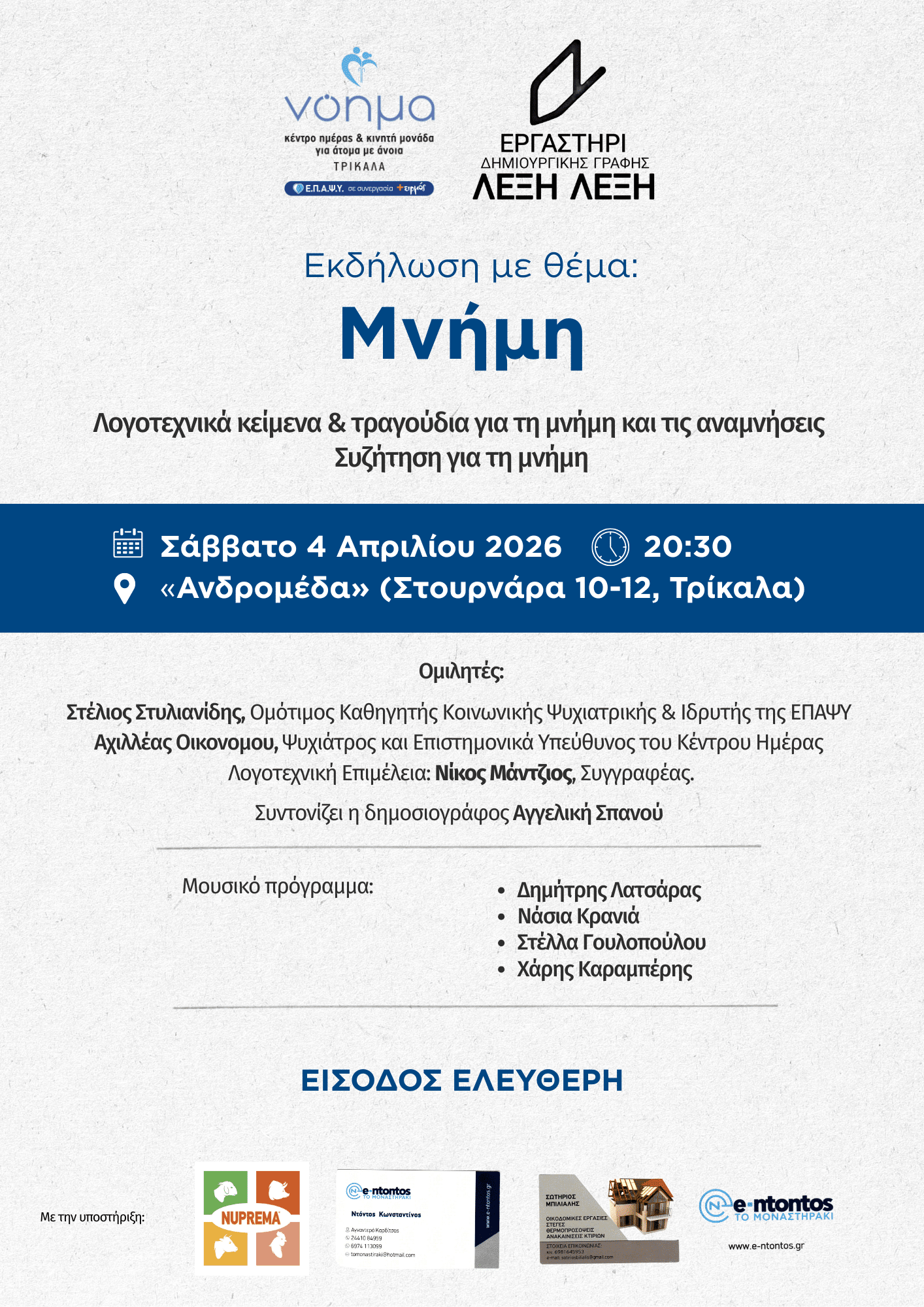 Το Κέντρο Ημέρας για Άτομα με Άνοια «ΝΟΗΜΑ» Τρικάλων της ΕΠΑΨΥ, σε συνεργασία με το Εργαστήρι Δημιουργικής Γραφής «ΛΕΞΗ-ΛΕΞΗ» του συγγραφέα Νίκου Μάντζιου, διοργανώνουν το Σάββατο 4 Απριλίου 2026, στις 20:30, στον χώρο «Ανδρομέδα», εκδήλωση αφιερωμένη στη θεματική της «Μνήμης».