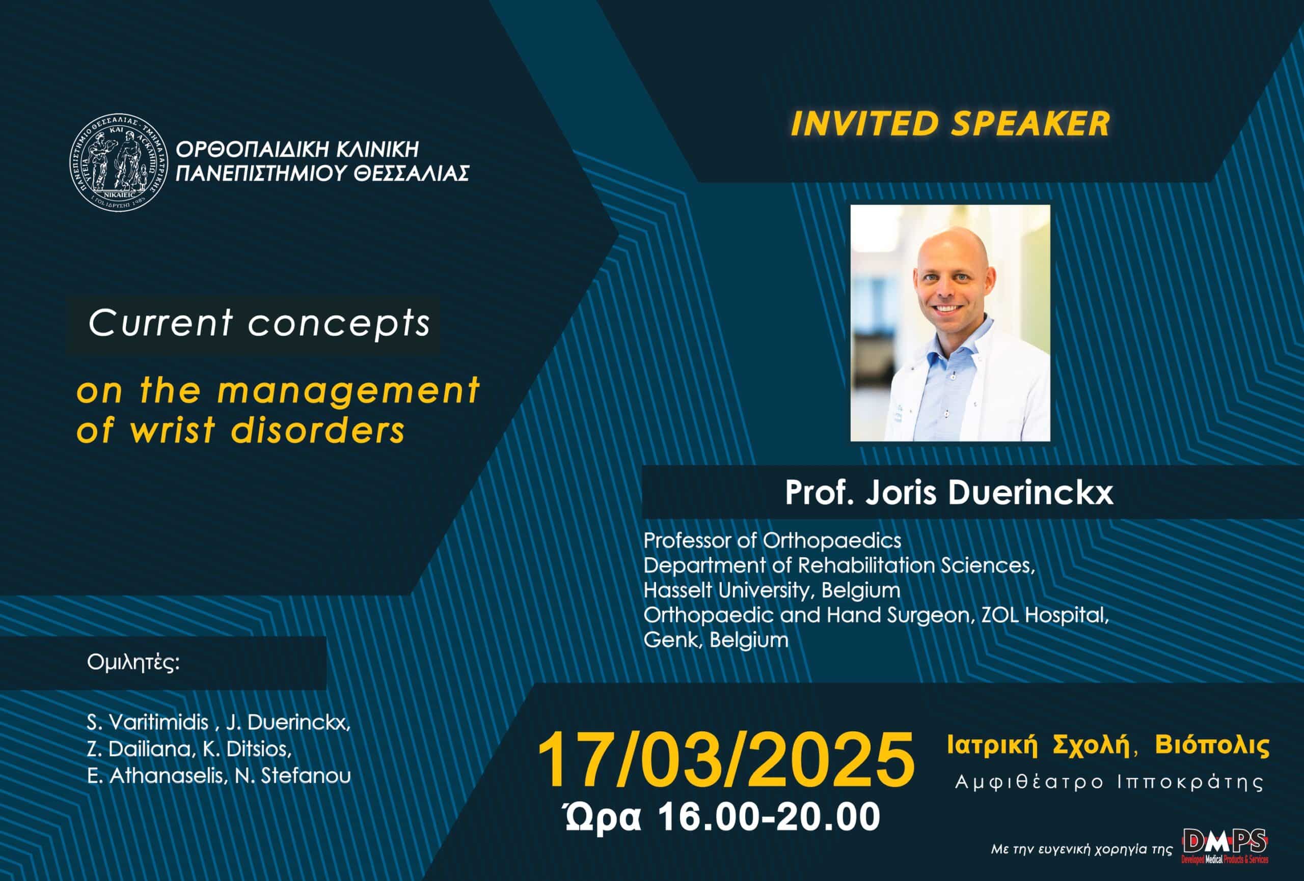 σας προσκαλούμε στην επιστημονική εκδήλωση με τίτλο «Current concepts on the management of wrist disorders – Σύγχρονες απόψεις για την αντιμετώπιση των παθήσεων του καρπού», η οποία θα πραγματοποιηθεί στο μεγάλο αμφιθέατρο «Ιπποκράτης» της Ιατρικής Σχολής, στη Βιόπολη της Λάρισας, τη Δευτέρα 17 Μαρτίου 2025 και ώρα 16.00-20.00, στο πλαίσιο της επίσκεψης του Καθηγητή Joris Duerinckx στην Ορθοπαιδική Κλινική του Πανεπιστημίου Θεσσαλίας.