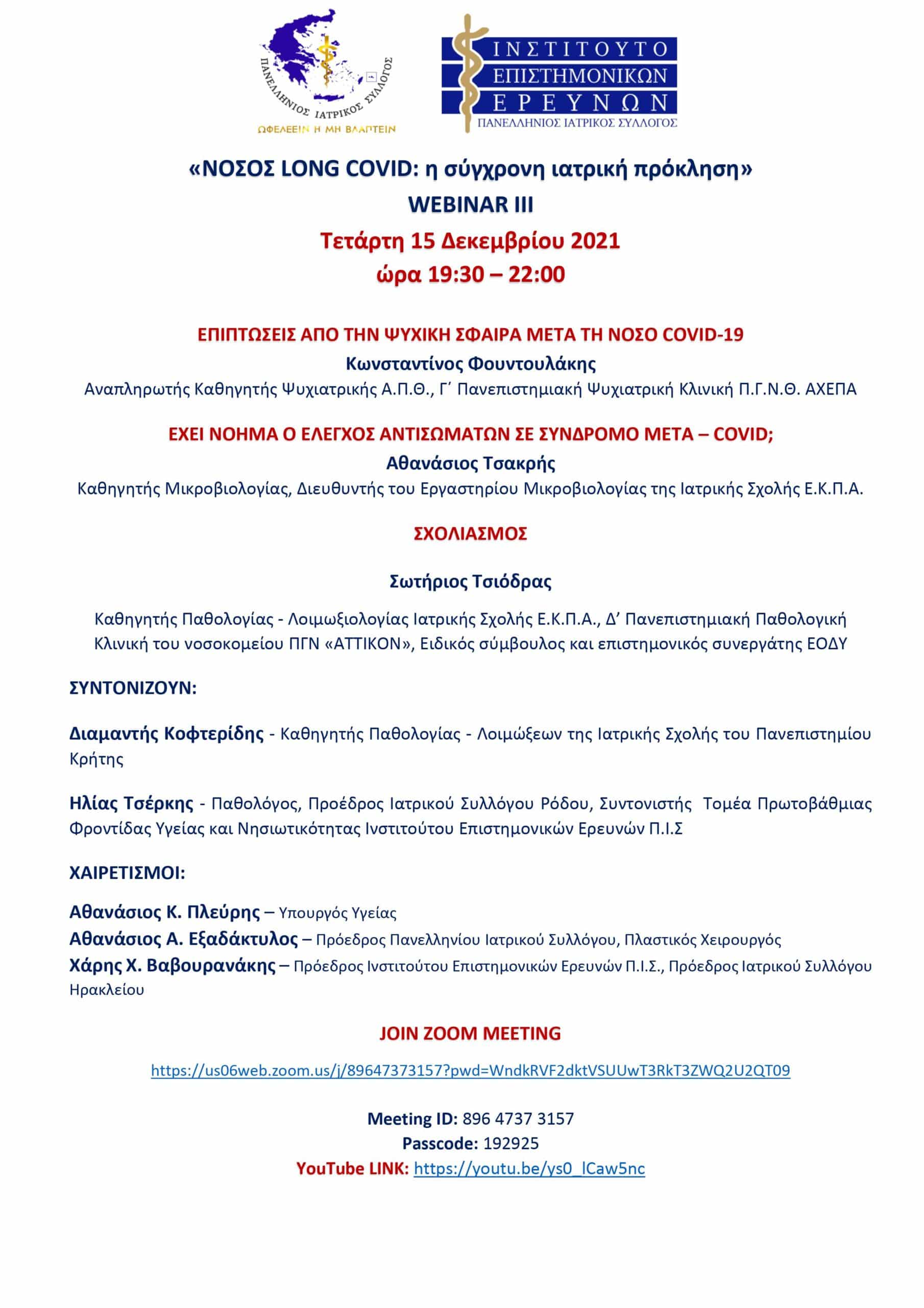 ΠΙΣ: «ΝΟΣΟΣ LONG COVID: η Σύγχρονη ιατρική πρόκληση» WEBINAR III 14:29 2021-12-13 - grammateia «ΝΟΣΟΣ LONG COVID: η Σύγχρονη ιατρική πρόκληση» WEBINAR III – 15/12/2021 19:30 – 22:00 Webinar III_15_12_2021 ΠΡΟΓΡΑΜΜΑ WEBINARS 2021