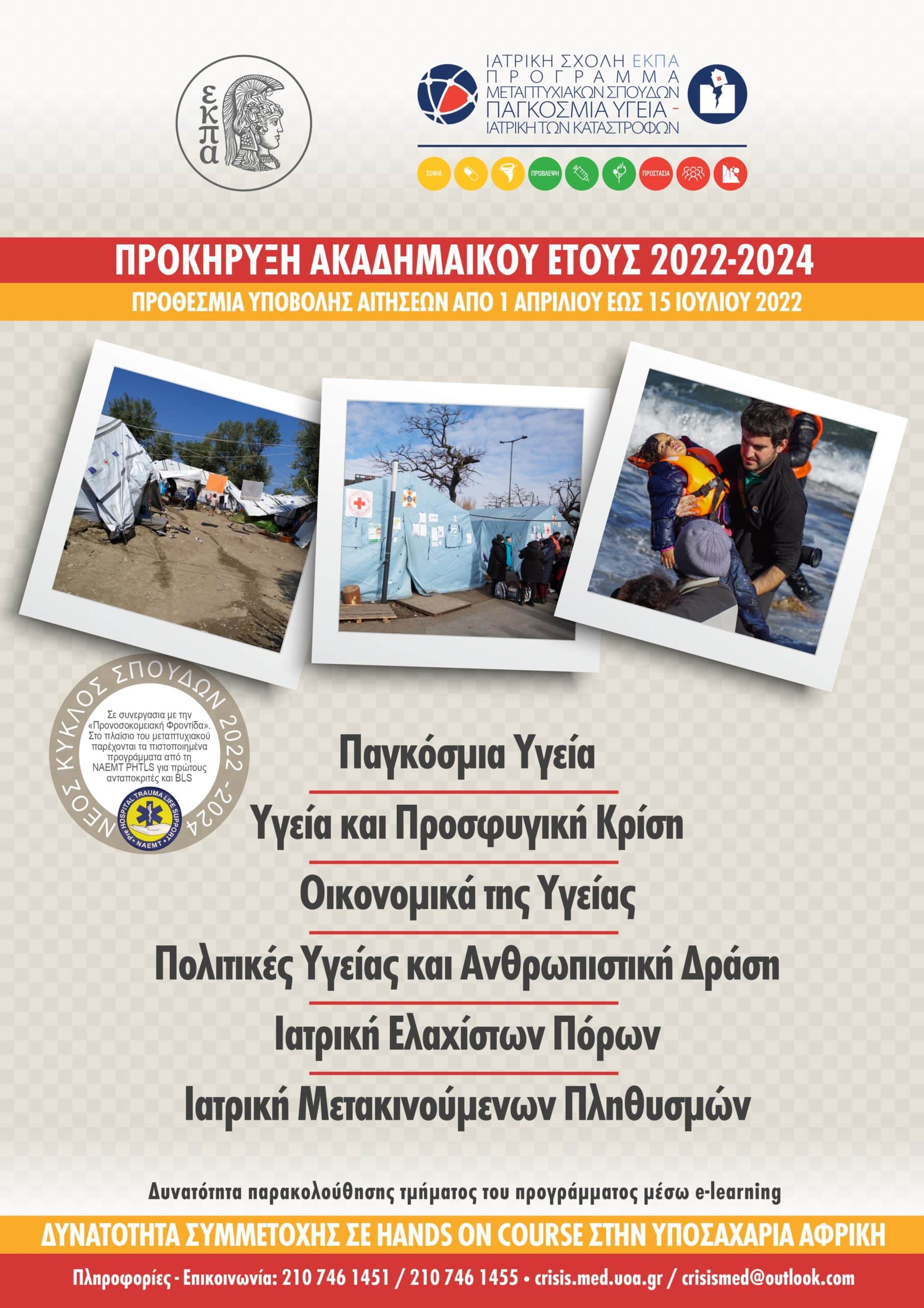 Το ΠΜΣ «Παγκόσμια Υγεία – Ιατρική των Καταστροφών» (τροποποίηση του τίτλου του ΠΜΣ «Διεθνής Ιατρική – Διαχείριση Κρίσεων Υγείας») της Ιατρικής Σχολής του Εθνικού και Καποδιστριακού Πανεπιστημίου Αθηνών προκηρύσσει για το προσεχές ακαδημαϊκό έτος 2022-2024 το νέο κύκλο σπουδών.