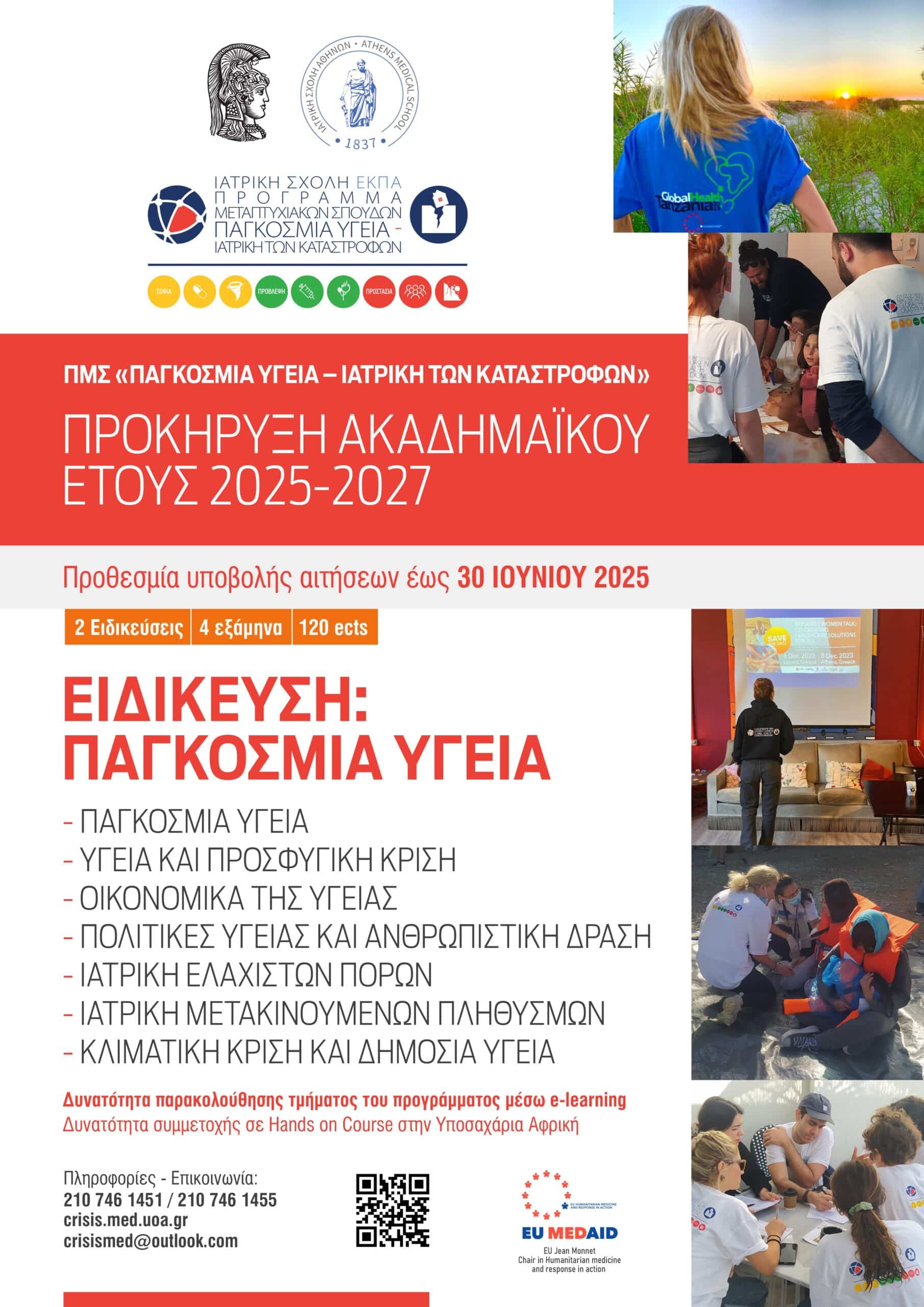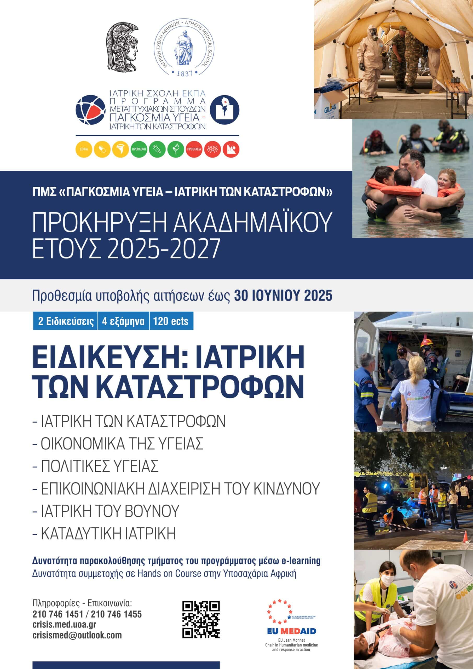 Το ΠΜΣ «Παγκόσμια Υγεία – Ιατρική των Καταστροφών» της Ιατρικής Σχολής του Εθνικού και Καποδιστριακού Πανεπιστημίου Αθηνών προκηρύσσει το νέο κύκλο σπουδών για τα ακαδημαϊκά έτη 2025-2027.