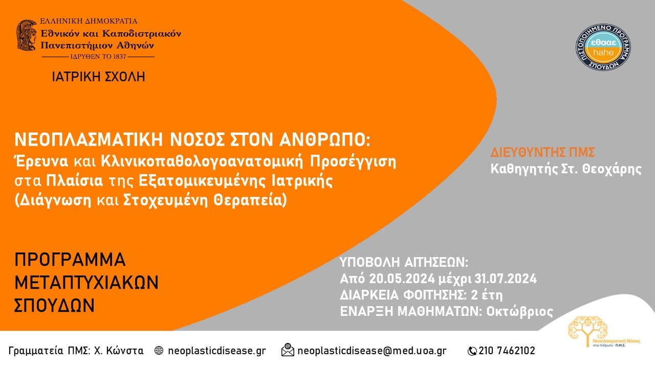 προκήρυξη για την εισαγωγή νέων φοιτητών για το ακαδημαϊκό έτος 2024-2025 για το μεταπτυχιακό ΠΜΣ «Νεοπλασματική Νόσος στον Άνθρωπο: Έρευνα και Κλινικοπαθολογοανατομική Προσέγγιση στα Πλαίσια της Εξατομικευμένης Ιατρικής (Διάγνωση και Στοχευμένη Θεραπεία)» της Ιατρικής Σχολής του ΕΚΠΑ.