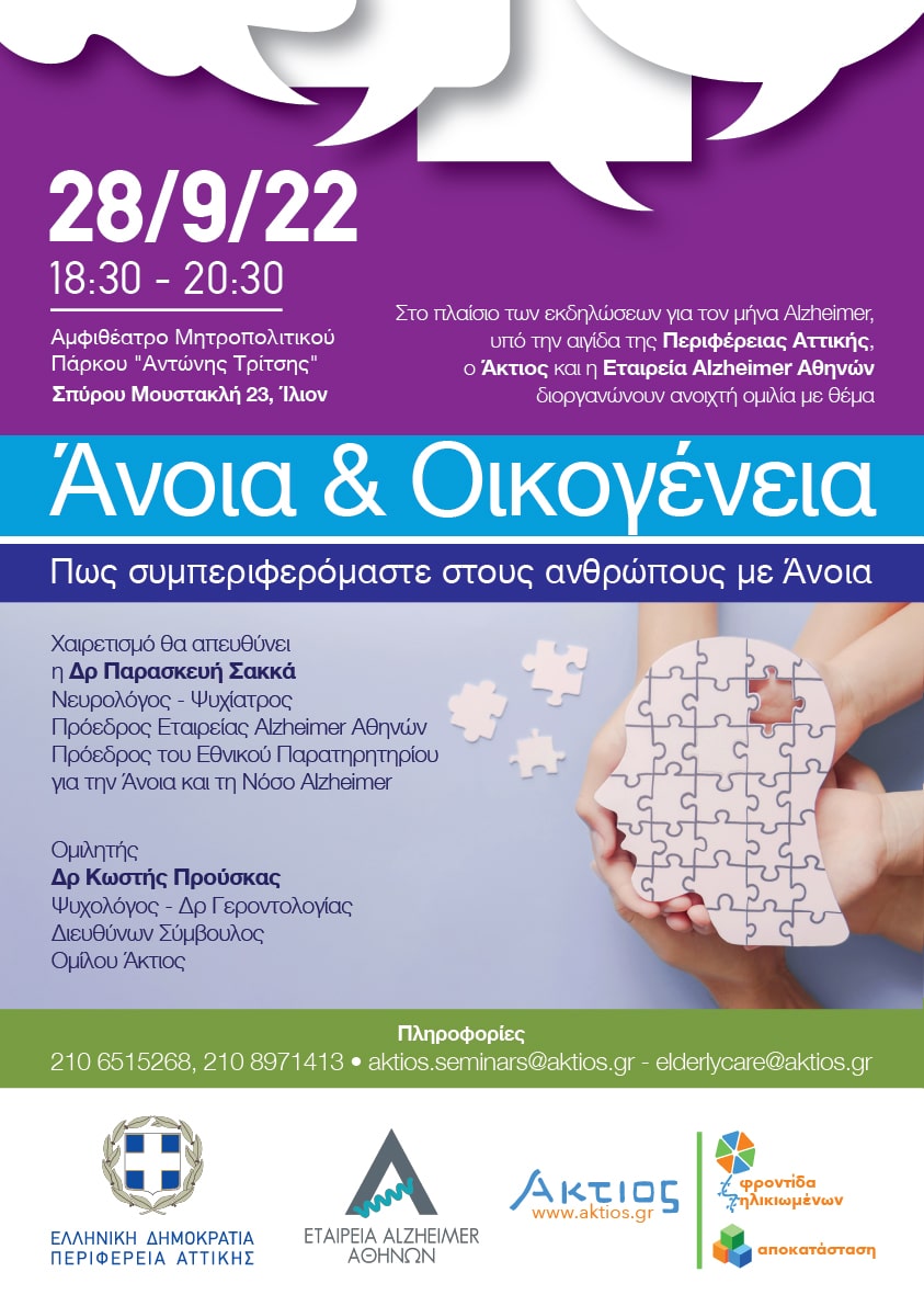 Στο πλαίσιο των εκδηλώσεων για τον μήνα Alzheimer, υπό την αιγίδα της Περιφέρειας Αττικής, ο Άκτιος και η Εταιρεία Alzheimer Αθηνών διοργανώνουν ανοιχτή ομιλία με θέμα «Άνοια & Οικογένεια – Πως συμπεριφερόμαστε στους ανθρώπους με άνοια.»