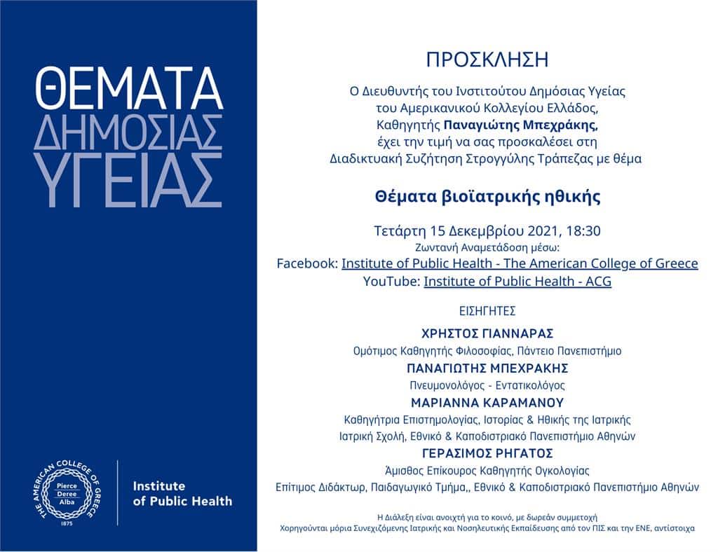 Πρόσκληση Ινστιτούτου Δημόσιας Υγείας _Θέματα Βιοϊατρικής Ηθικής_15.12.2021