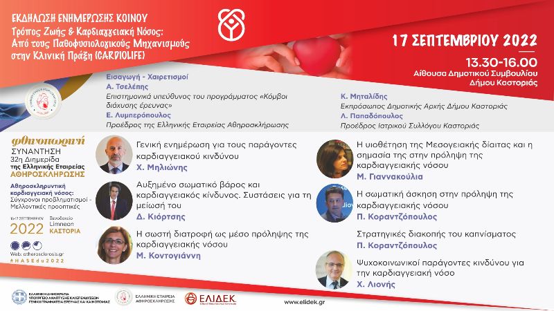Στο πλαίσιο του προγράμματος ΕΛΙΔΕΚ με τίτλο «Τρόπος Ζωής & Καρδιαγγειακή Νόσος: Από τους Παθοφυσιολογικούς Μηχανισμούς στην Κλινική Πράξη» και σύμφωνα με το πρόγραμμα των webinars (https://cardio-life.eu/webinars), η έναρξη των διαλέξεων του Α΄ κύκλου εκπαίδευσης νέων επιστημόνων θα γίνει αύριο Τετάρτη 07/09/2022 ώρα 17:00-18:00.