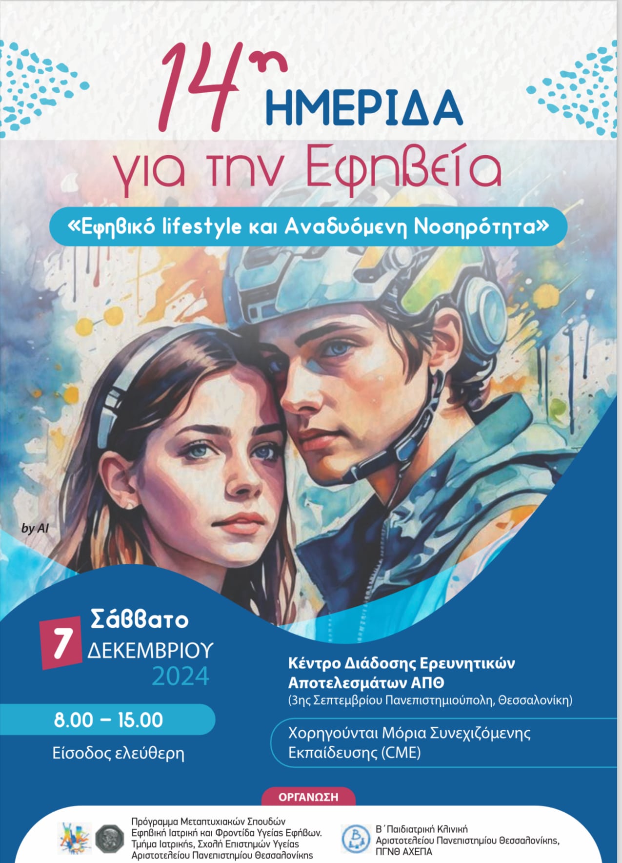 Με ιδιαίτερη χαρά σας προσκαλούμε στην 14η Ημερίδα για την Εφηβεία, η οποία θα πραγματοποιηθεί το Σάββατο 7 Δεκεμβρίου 2024 στο Κέντρο Διάδοσης Ερευνητικών Αποτελεσμάτων (ΚΕΔΕΑ) του ΑΠΘ.