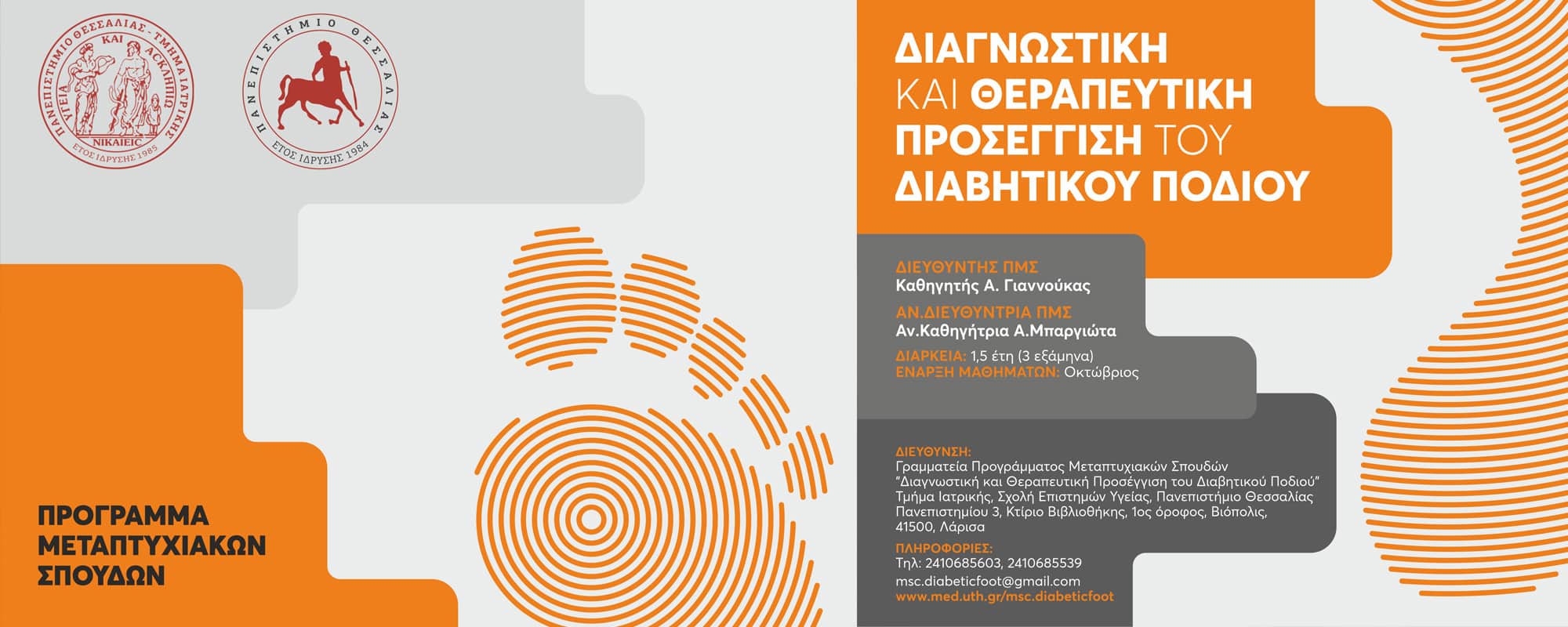 ΔΙΑΓΝΩΣΤΙΚΗ ΚΑΙ ΘΕΡΑΠΕΥΤΙΚΗ ΠΡΟΣΕΓΓΙΣΗ ΤΟΥ ΔΙΑΒΗΤΙΚΟΥ ΠΟΔΙΟΥ Το Τμήμα Ιατρικής της Σχολής Επιστημών Υγείας του Πανεπιστημίου Θεσσαλίας, ανακοινώνει την έναρξη υποβολής αιτήσεων για το ακαδημαϊκό έτος 2023-2024 του Προγράμματος Μεταπτυχιακών Σπουδών (ΠΜΣ) με τίτλο: «Διαγνωστική και Θεραπευτική Προσέγγιση του Διαβητικού Ποδιού». Το Π.Μ.Σ. «Διαγνωστική και Θεραπευτική Προσέγγιση του Διαβητικού Ποδιού» απονέμει Δίπλωμα Μεταπτυχιακών Σπουδών (Δ.Μ.Σ.) με τίτλο: «Διαγνωστική και Θεραπευτική Προσέγγιση του Διαβητικού Ποδιού» (MSc in Diagnostic and Therapeutic Approach to Diabetic Foot) και διέπεται από τον Κανονισμό Μεταπτυχιακών Σπουδών του Πανεπιστημίου Θεσσαλίας. ΔΙΕΥΘΥΝΤΗΣ ΠΜΣ: Καθηγητής Α. Γιαννούκας ΑΝ. ΔΙΕΥΘΥΝΤΡΙΑ ΠΜΣ: Αν. Καθηγήτρια Α. Μπαργιώτα