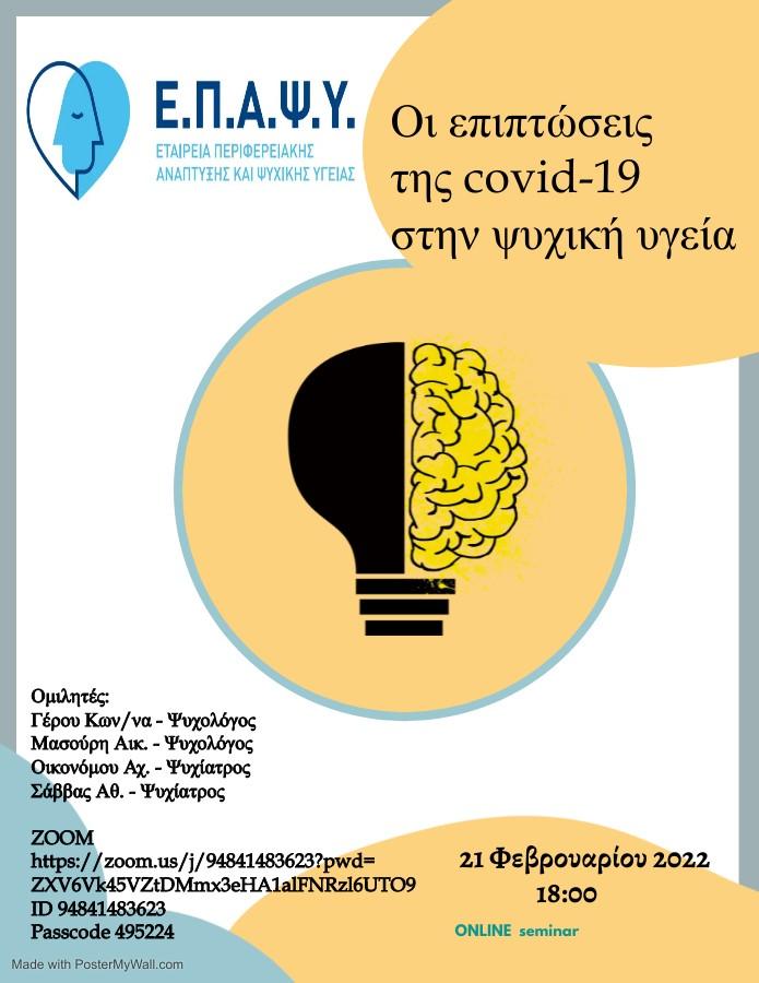 Οι Μονάδες Ψυχοκοινωνικής Αποκατάστασης της ΕΠΑΨΥ στην Στερεά Ελλάδα και στη Θεσσαλία διοργανώνουν διαδικτυακό σεμινάριο. Η θεματική του σεμιναρίου είναι «οι επιπτώσεις της covid-19 στην ψυχική υγεία».