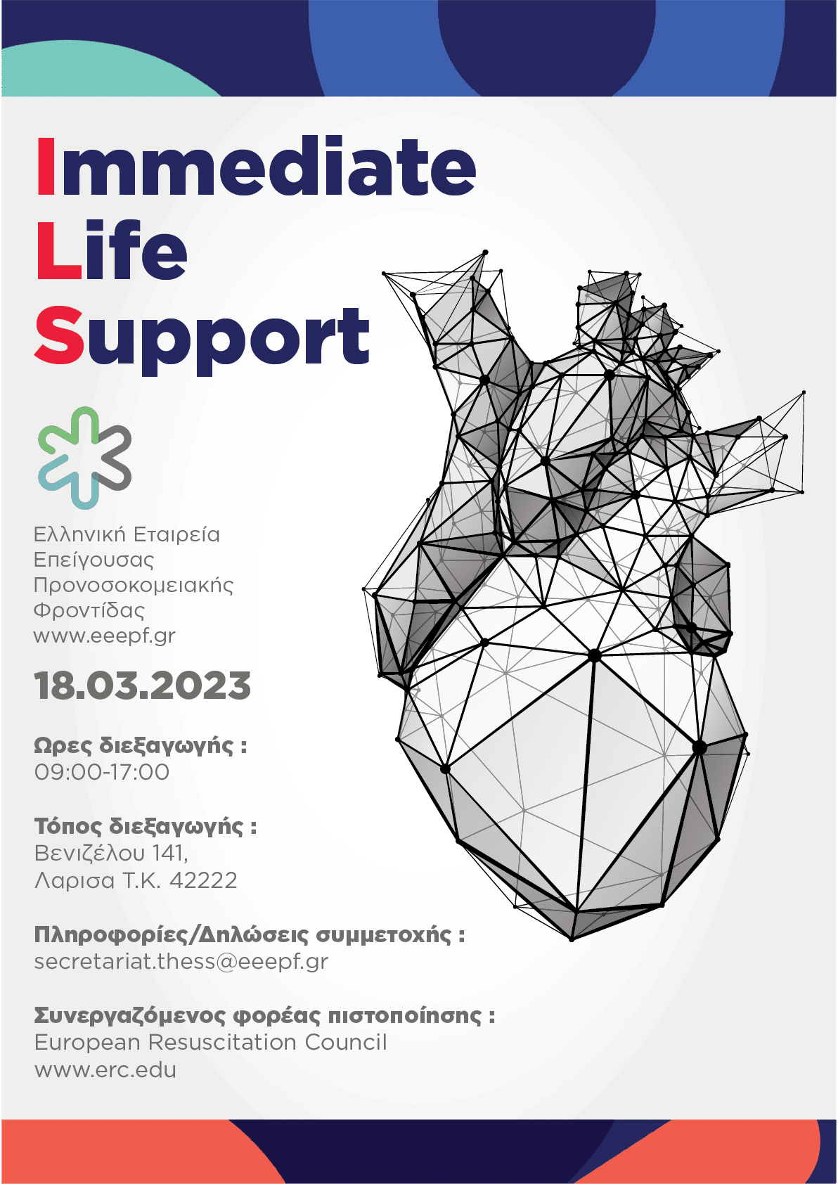 Με μεγάλη χαρά η Ελληνική Εταιρεία Επείγουσας Προνοσοκομειακής Φροντίδας ανακοινώνει τη διοργάνωση σεμιναρίου «Immediate Life Support – Άμεση Υποστήριξη της Ζωής», το Σάββατο 18 Μαρτίου 2023, 09:00 – 17:00, στα γραφεία της εταιρείας στη Λάρισα [Βενιζέλου 141].