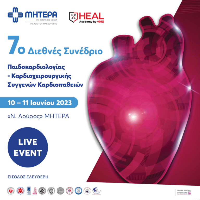 Το 7ο διήμερο Συνέδριο Παιδοκαρδιολογίας και Καρδιοχειρουργικής Συγγενών Καρδιοπαθειών διοργανώνεται από τις Κλινικές Παιδοκαρδιολογίας – Καρδιοχειρουργικής Συγγενών Καρδιοπαθειών ΜΗΤΕΡΑ, στις 10 & 11 Ιουνίου 2023.
