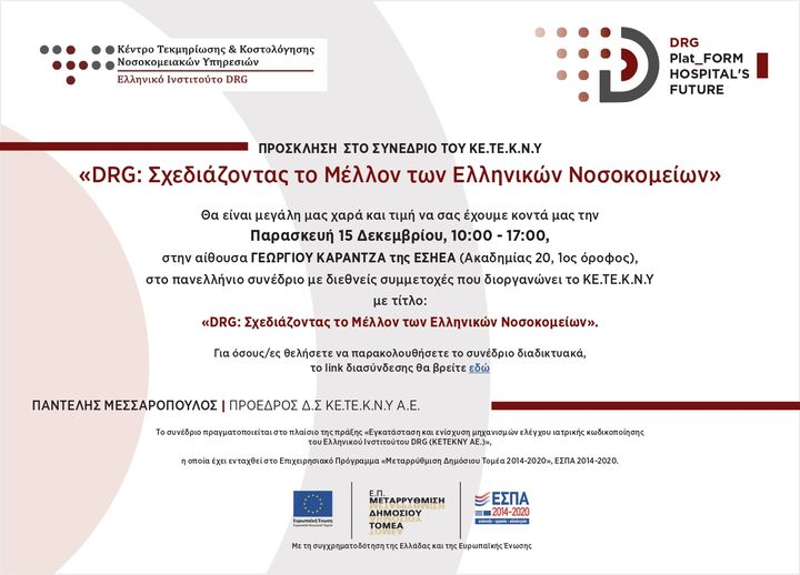 Συνέδριο διογανώνει το ΚΕΤΕΚΝΥ με θέμα «DRG :Σχεδιάζοντας το Μέλλον των Ελληνικών Νοσοκομείων» την Παρασκευυή 15 Δεκεμβρίου από τις 10 το πρωί έως τις 5 το απόγευμα στην αίθουσα Γεωργίου Καραντζά της ΕΣΗΕΑ. Πρόκειται για πανελλήνιο συνέδριο με διεθνείς συμμετοχές που διοργανώνει το ΚΕΤΕΚΝΥ.