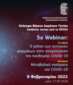 Το 5o Webinar του ΕΚΠΑ από την σειρά Webinars-Επίκαιρα Θέματα Δημόσιας Υγείας είναι αφιερωμένο στον ρόλο των αντιιικών φαρμάκων στην αντιμετώπιση της πανδημίας COVID-19. Διακεκριμένοι επιστήμονες θα ενημερώσουν για τα νεότερα δεδομένα σχετικά με τα αντιικά φάρμακα καθώς και τη σχέση διάφορων μεταβολικών νοσημάτων με τη νόσο COVID-19.