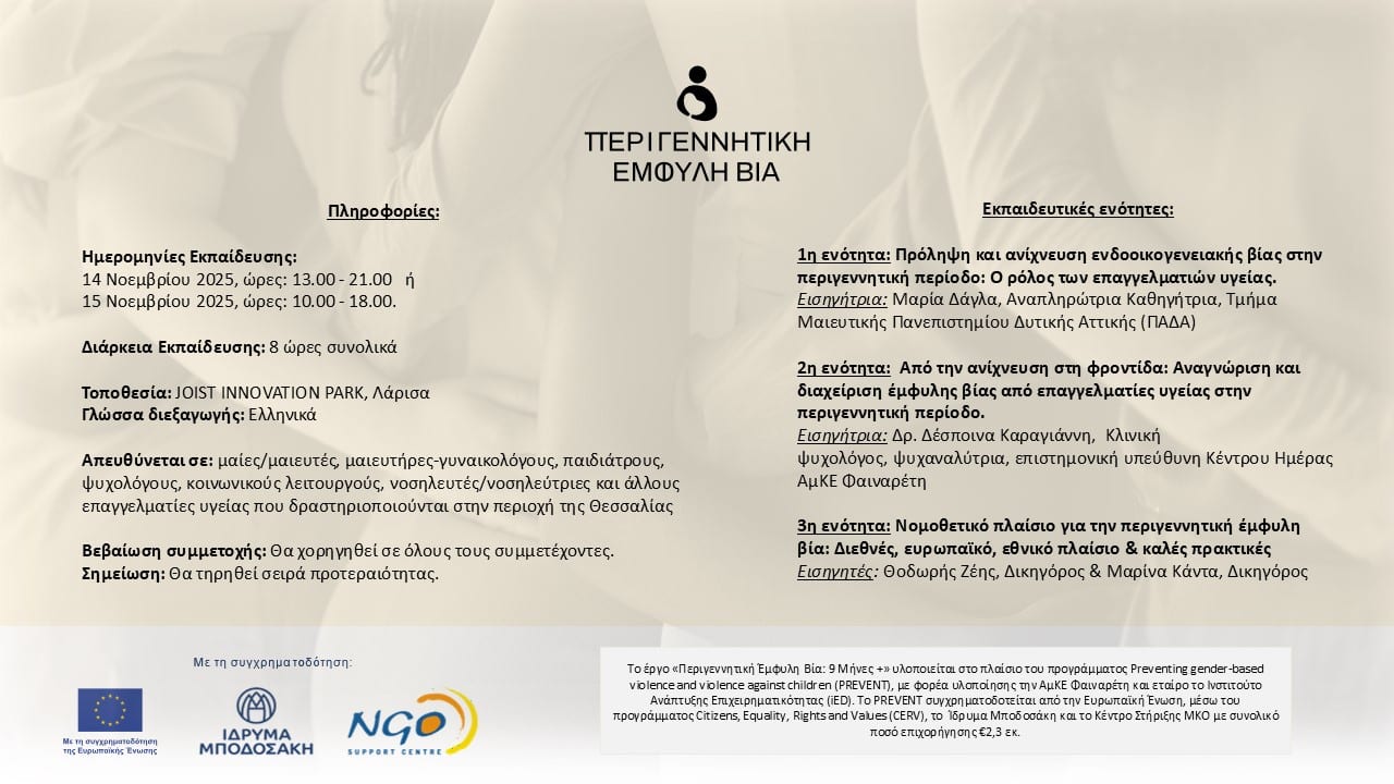 Με μεγάλη χαρά σας προσκαλούμε στο εκπαιδευτικό σεμινάριο για την περιγεννητική έμφυλη βία με τίτλο: «Δίπλα στη μητέρα – Ενάντια στη βία», η οποία πραγματοποιείται στο πλαίσιο του έργου «Περιγεννητική Έμφυλη Βία: 9 Μήνες +».
