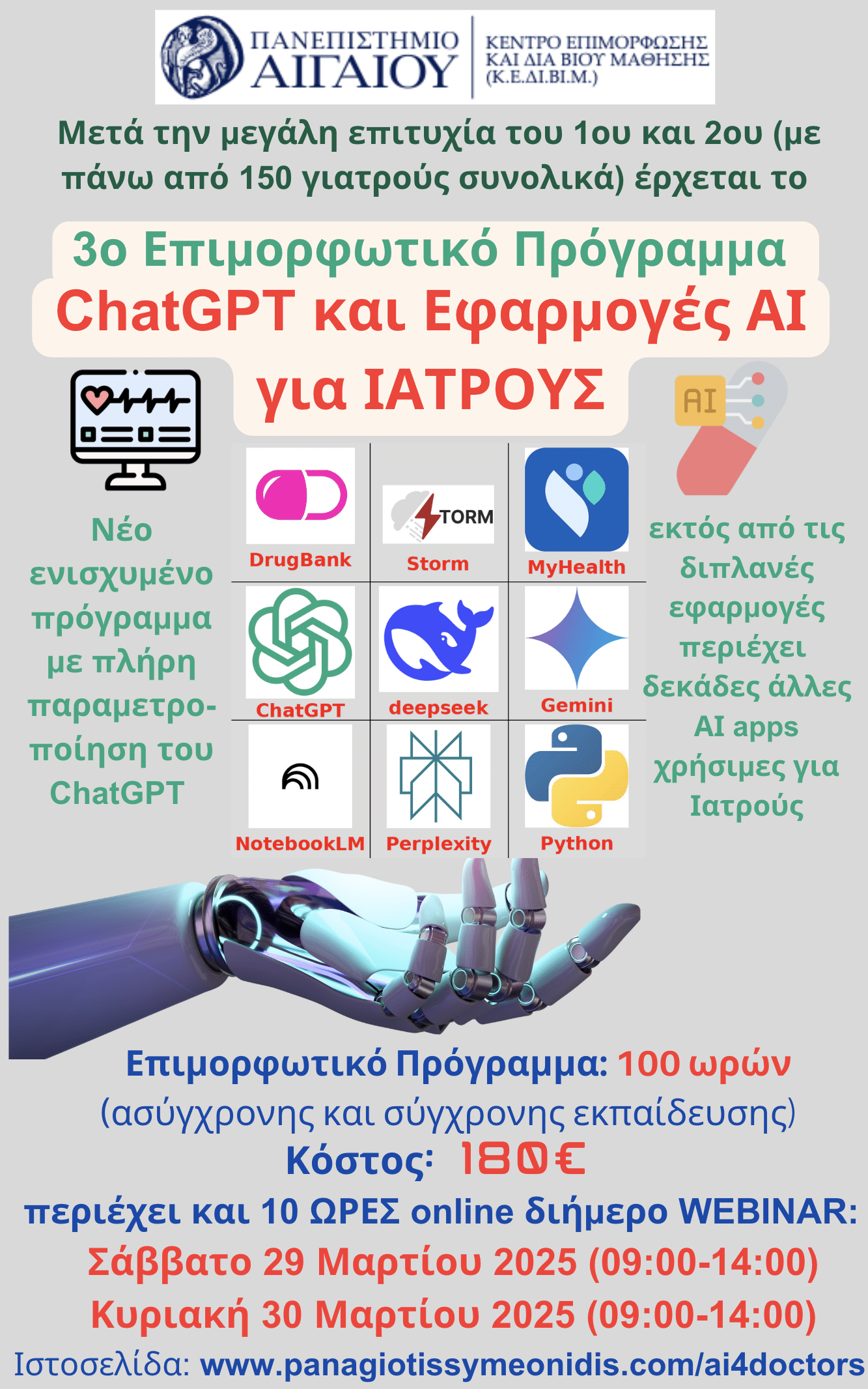 Διεξαγωγή του 3ου Επιμορφωτικού Προγράμματος “ChatGPT και Εφαρμογές ΑΙ για Ιατρούς” του Πανεπιστημίου Αιγαίου, το οποίο θα διενεργηθεί τόσο ασύγχρονα όσο και με online μέθοδο διδασκαλίας μέσω Webinar το Σάββατο 29 και την Κυριακή 30 Μαρτίου 2025. Το 3ο Επιμορφωτικό Πρόγραμμα έχει ενισχυθεί και αναμορφωθεί σημαντικά αφού λάβαμε υπόψιν μας τις ανάγκες και τα αιτήματα των 150 συνολικά γιατρών που συμμετείχαν στα προηγούμενα δυο πολύ επιτυχημένα επιμορφωτικά μας προγράμματα.