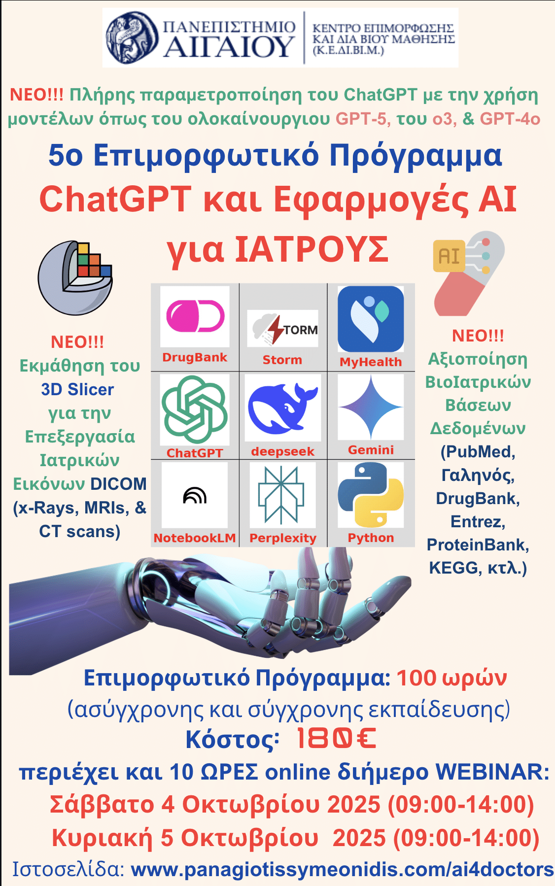 διεξαγωγή του 5ου Επιμορφωτικού Προγράμματος  “ChatGPT και Εφαρμογές ΑΙ για Ιατρούς”  του Πανεπιστημίου Αιγαίου, το οποίο θα διενεργηθεί τόσο ασύγχρονα όσο και με online μέθοδο διδασκαλίας μέσω Webinar το Σαββατοκύριακο 4 και 5 Οκτωβρίου 2025. Το 5ο Επιμορφωτικό Πρόγραμμα  έχει ενισχυθεί και αναμορφωθεί σημαντικά και πλέον περιέχει το ολοκαίνουργιο GPT-5 και την εκμάθηση του 3D Slicer για την διαχείριση ιατρικών εικόνων DICOM(x-rays, MRIs, & CT scans).