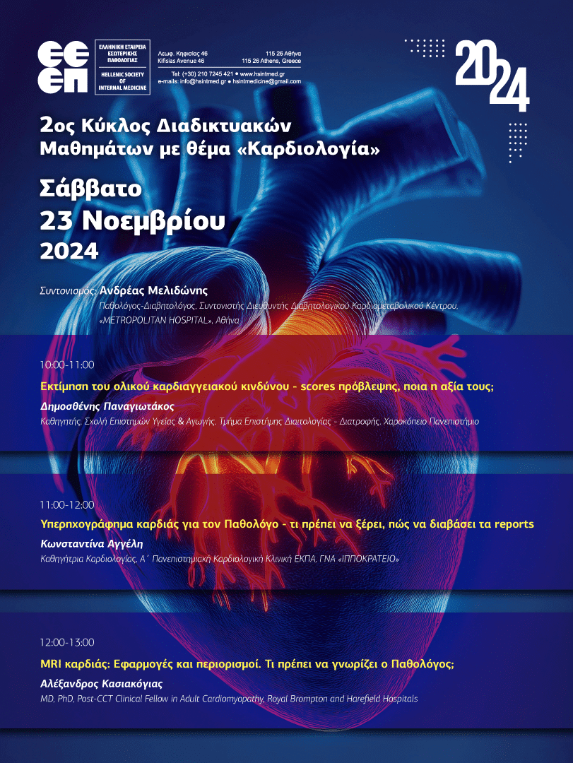 Η Ελληνική Εταιρεία Εσωτερικής Παθολογίας (Ε.Ε.Ε.Π.), στο πλαίσιο των εκπαιδευτικών της δραστηριοτήτων, συνεχίζει τους εκπαιδευτικούς κύκλους μαθημάτων για τους ειδικευόμενους (και όχι μόνον) Ιατρούς στην Εσωτερική Παθολογία, με στόχο να καλυφθούν τα κύρια γνωστικά αντικείμενα που περιλαμβάνονται στο Curriculum της ειδικότητας της Εσωτερικής Παθολογίας, όπως καθορίζεται στο ΦΕΚ 2856-Β (05-07-2019).