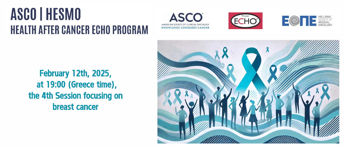 Με χαρά σας προσκαλούμε σήμερα Τετάρτη 12 Φεβρουαρίου 2025 (19:00 έως 20:30, ώρα Ελλάδας) στην 4η συνάντηση του πρωτοποριακού προγράμματος που οργανώνει η ΕΟΠΕ σε συνεργασία με το ASCO και τίτλο: Health After Cancer ECHO Program.