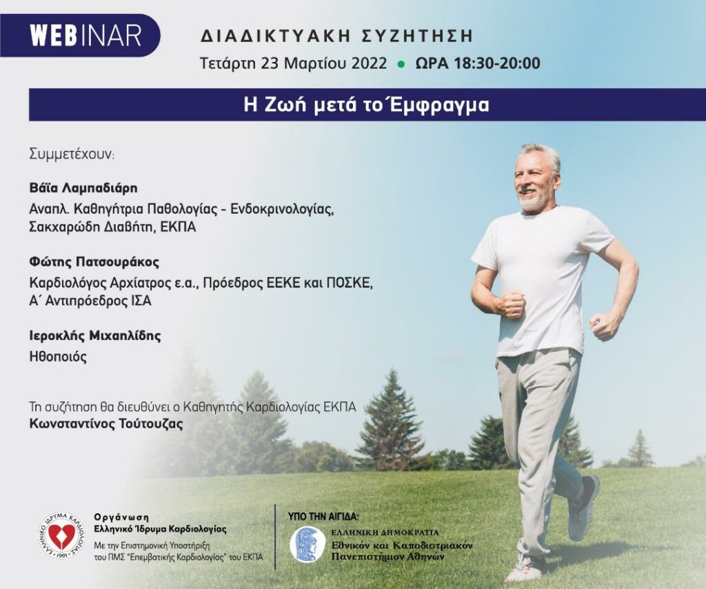 Το Ελληνικό Ίδρυμα Καρδιολογίας (ΕΛ.Ι.ΚΑΡ) διοργανώνει το webinar με θέμα «Η Ζωή μετά το έμφραγμα». Στόχος είναι η αξιόπιστη ενημέρωση του κοινού για μία από τις κύριες αιτίες θανάτου ανδρών και γυναικών, παγκοσμίως.
