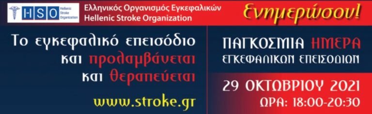 Διαδικτυακή εκδήλωση πραγματοποιεί ο Ελληνικός Οργανισμός Εγκεφαλικών στις 29 Οκτωβρίου, στο πλαίσιο της Παγκόσμιας Ημέρας Εγκεφαλικών. Στόχος είναι η ενημέρωση και η ανάδειξη ζητημάτων που αντιμετωπίζουν στην καθημερινότητα ασθενείς με αγγειακό εγκεφαλικό επεισόδιο και οι οικογένειές τους.